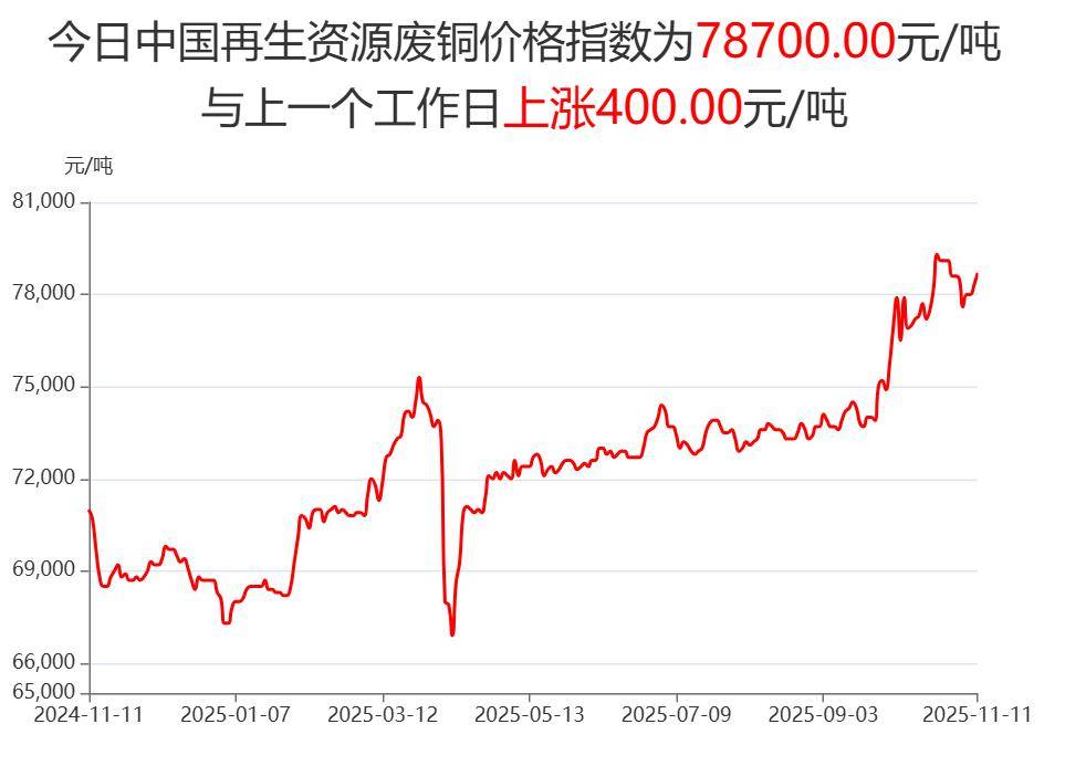 废铜:今日中国再生资源废铜价格为78700元/吨。望当地废铜商家密切关注价格走势,谨慎操作!