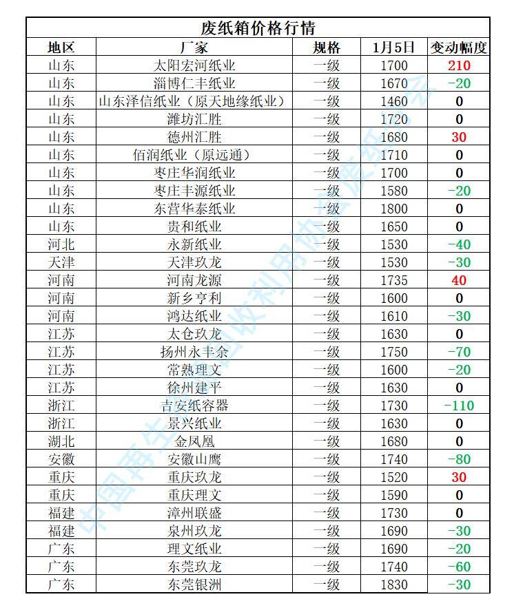 1月5日全国各地废纸价格行情一览